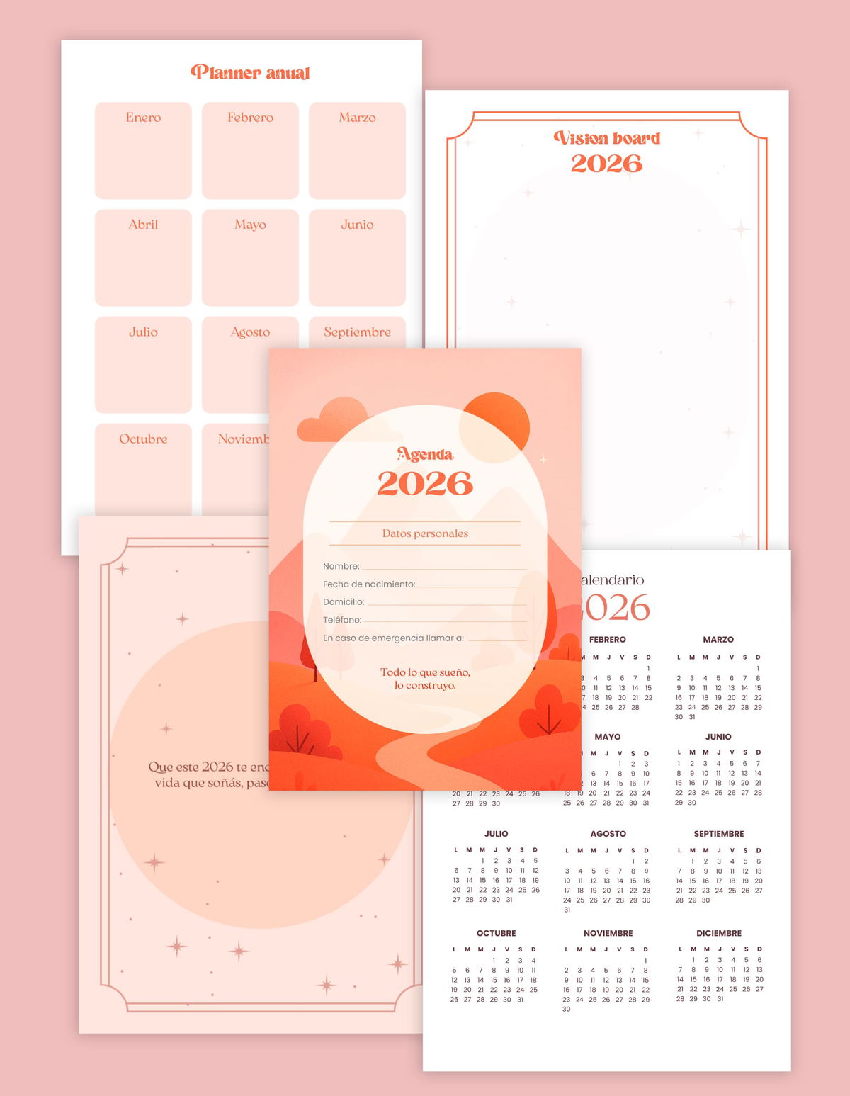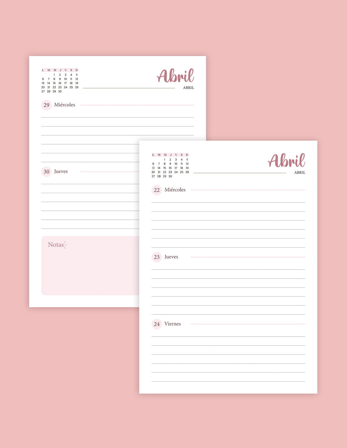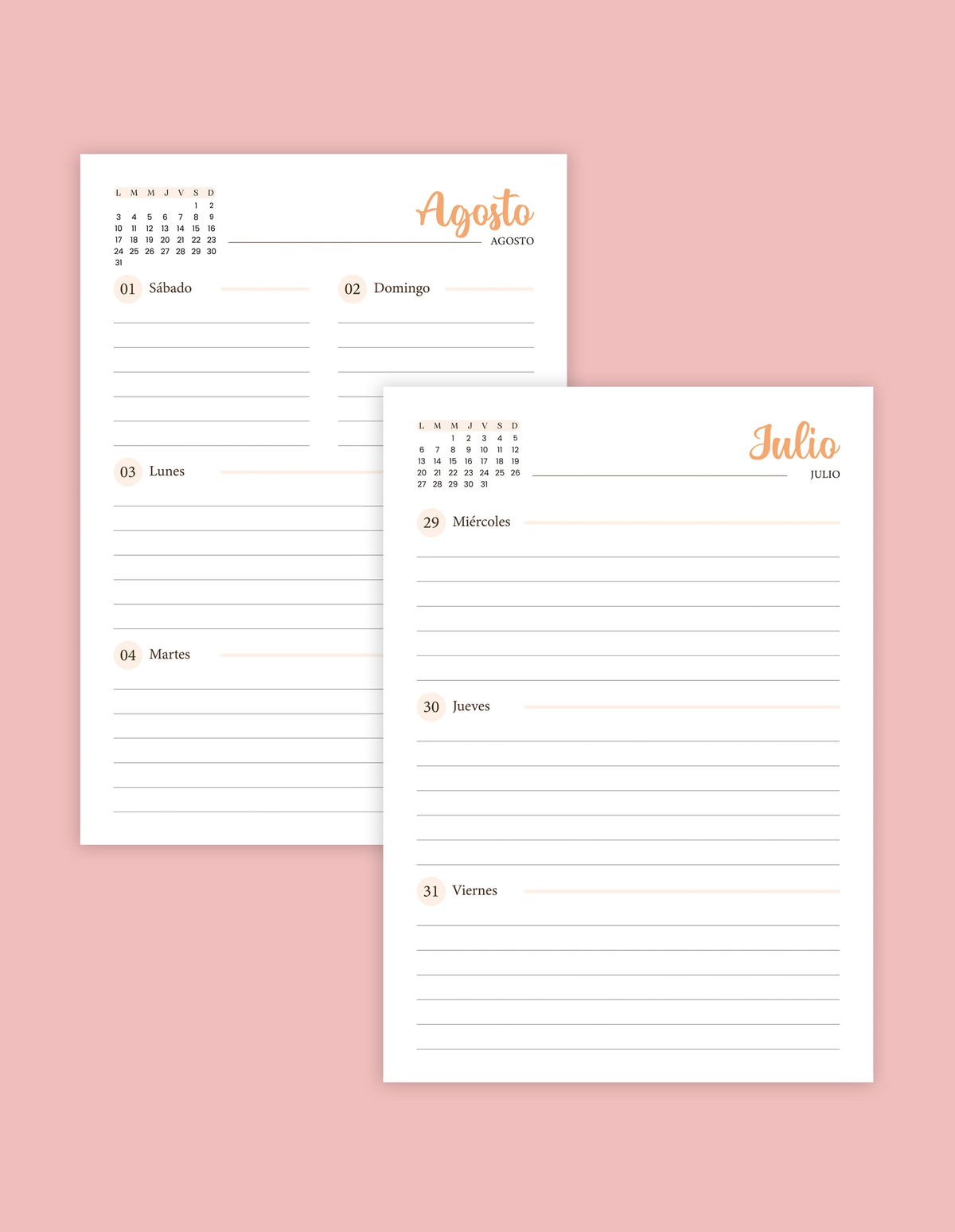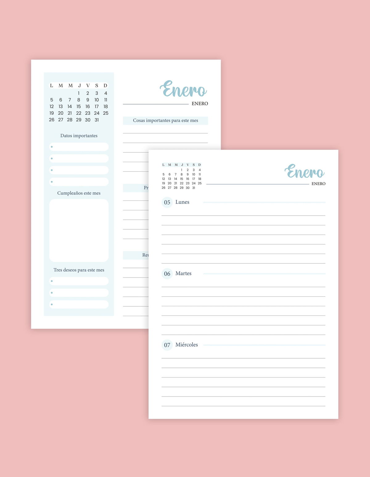 - Agenda de enero a diciembre semana a la vista. Cada comienzo de mes incluye una hoja con cosas importantes por anotar.